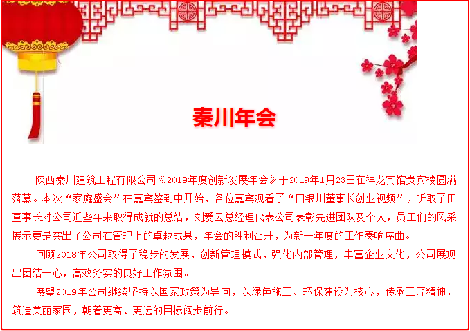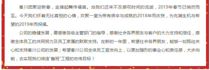 熱烈祝賀陜西秦川公司《2019年創(chuàng)新發(fā)展年會》圓滿落幕,恭祝大家:新年快樂,身體健康,闔家幸福!