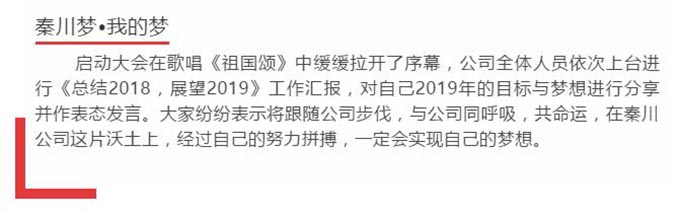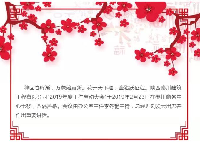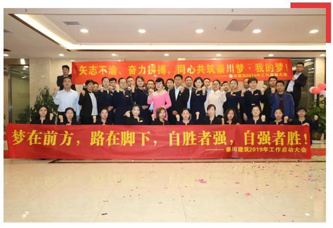 熱烈祝賀陜西秦川建筑工程有限公司“2019年度工作啟動大會”圓滿落幕。秦川建筑全體同仁斗志昂揚、迎接新挑戰(zhàn),我們將矢志不渝、齊心協(xié)力、奮力拼搏,同心共筑秦川夢·我的夢,譜寫秦川2019新華章。