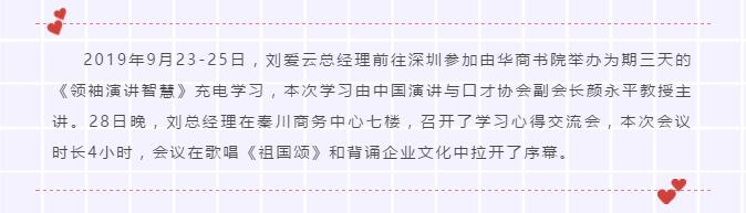 28日晚,劉總經(jīng)理在秦川商務(wù)中心七樓,召開了學(xué)習(xí)心得交流會(huì),本次會(huì)議時(shí)長4小時(shí),會(huì)議在歌唱《祖國頌》和背誦企業(yè)文化中拉開了序幕。